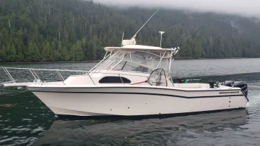 This boat is 30 feet in length and is the largest charter boat in the Vancouver Charter scene. It is our most popular boat for bigger groups and for those smaller groups who want lots of room. The boat has twin 250hp engines, and 15 hp trolling and top of the line fish finding equipment including autopilot. The heated cabin has a good sized private washroom with a flush toilet. Our Grady White Marlin can take up to 6 people comfortably. In some cases, like family groups we can accommodate 7 people on this boat, please call or email to inquire about 7 person groups.
